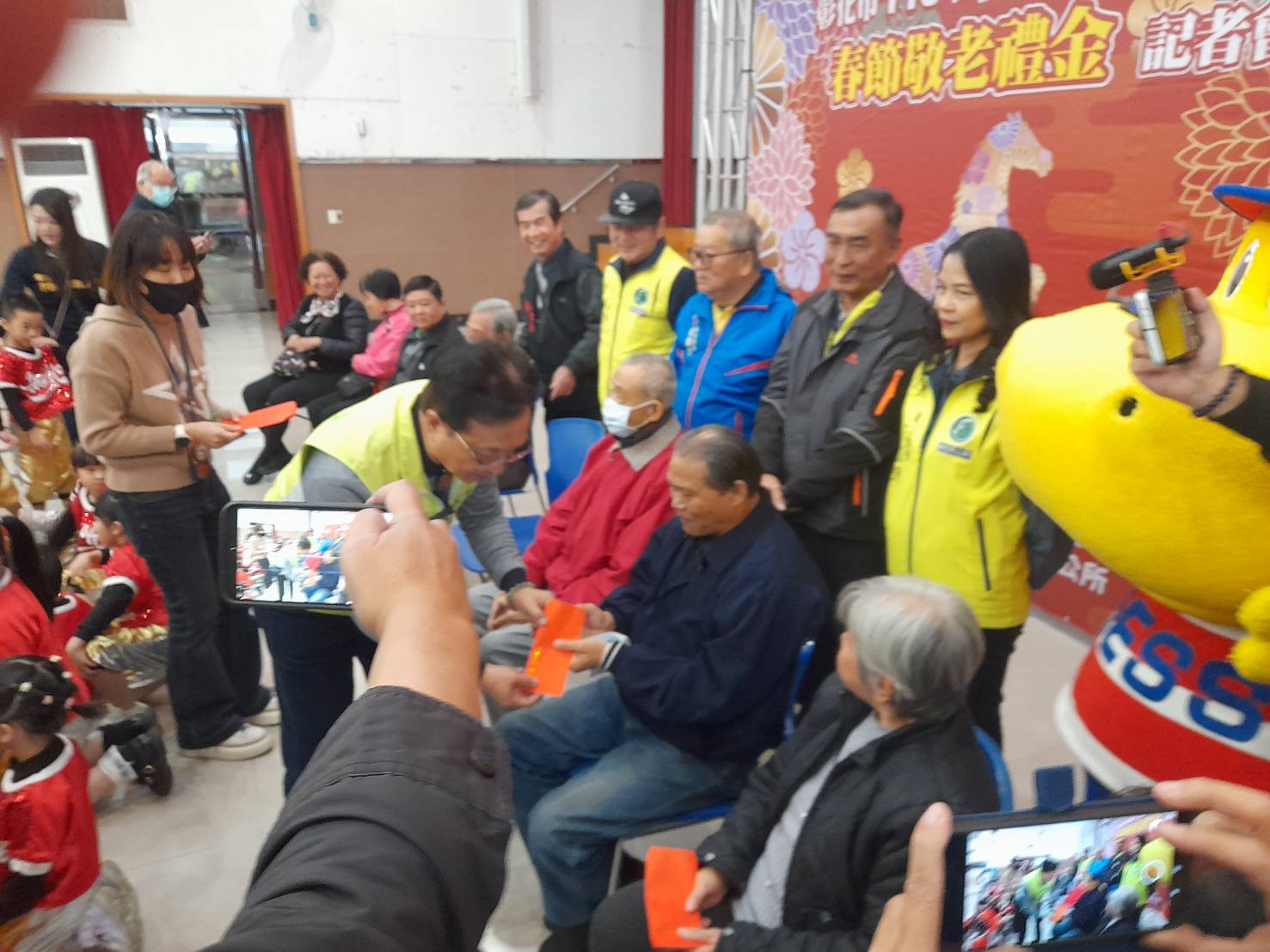 彰化市公所23日在生活藝文館舉行春節敬老禮金記者會,邀請李國輝先生、鄭登元先生、黄勝義先生、王栢昌先生、簡玉英女士、鐘秀蕊女士、皇甫娟女士、陳美惠女士等8人,代表彰市市的長者出席參加,林世賢市長逐一向長者致贈紅包,祝福長輩們每天都保持愉快的心情,健康又長壽及新年快樂。