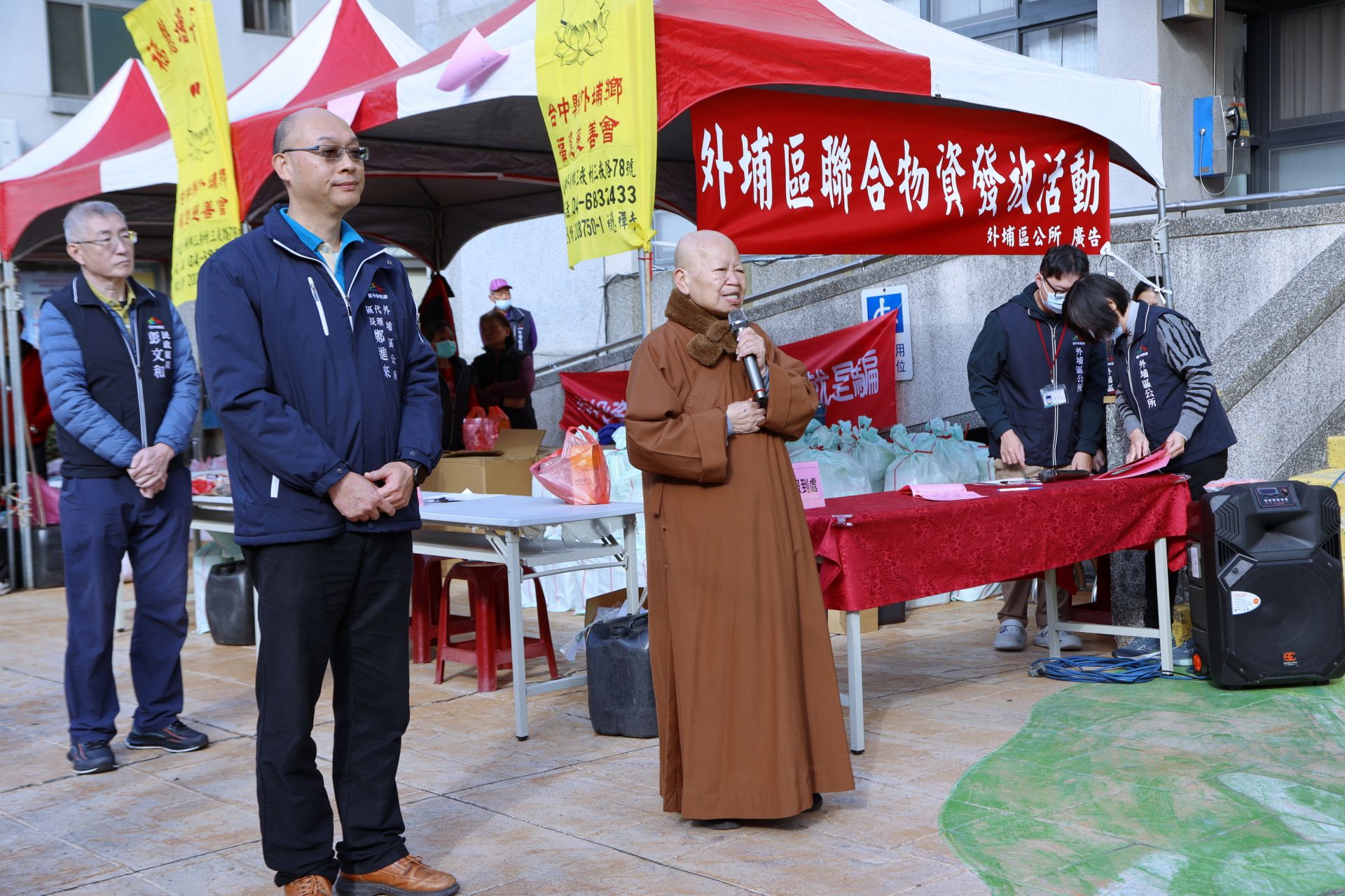 福慧禪寺住持釋觀行致詞說明,此次發放的民生物資包含醬油、白米、食用油、罐頭、麵條、平底鍋及外套等生活必需品,全數來自社會各界的愛心捐贈,將提供給外埔區212戶弱勢家庭,緩解其年節期間的生活負擔。