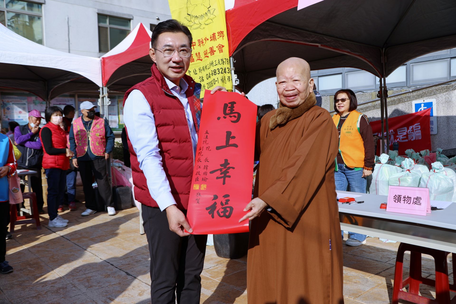立法院副院長江啟臣與釋住持共同展開寫有「馬上有福」的紅聯,象徵好運即至。江副院長指出,外埔鄉親情感厚實,宗教與企業攜手展現的「守望相助」精神是社會安定的基石,在寒流與年關之際,透過物資與保暖衣物,能將關懷直接傳遞到需要者的手中。
