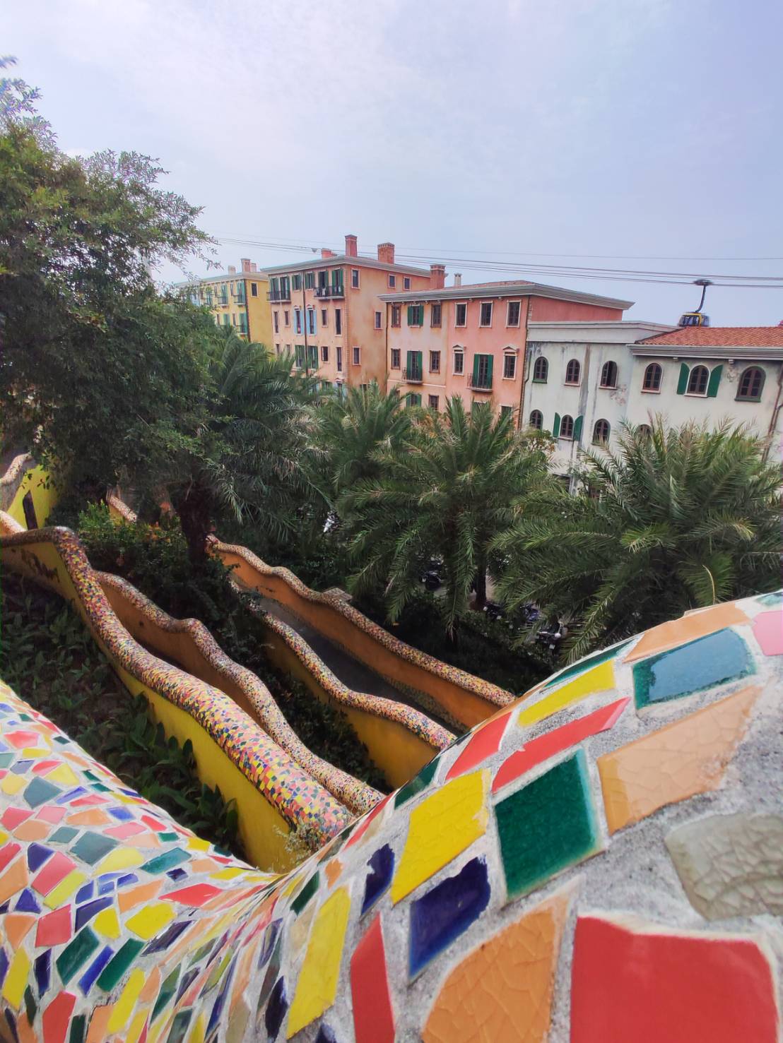 赭紅牆面、拱門石階、鐘樓與臨海露台,這裡像一座被移植到熱帶的歐洲小鎮。白天明亮清新,傍晚夕陽將整片海岸染成金橘色,纜車劃過天際線——畫面幾乎完美。