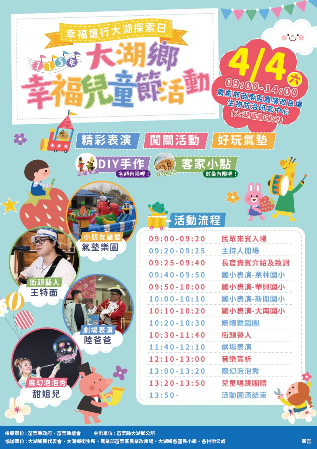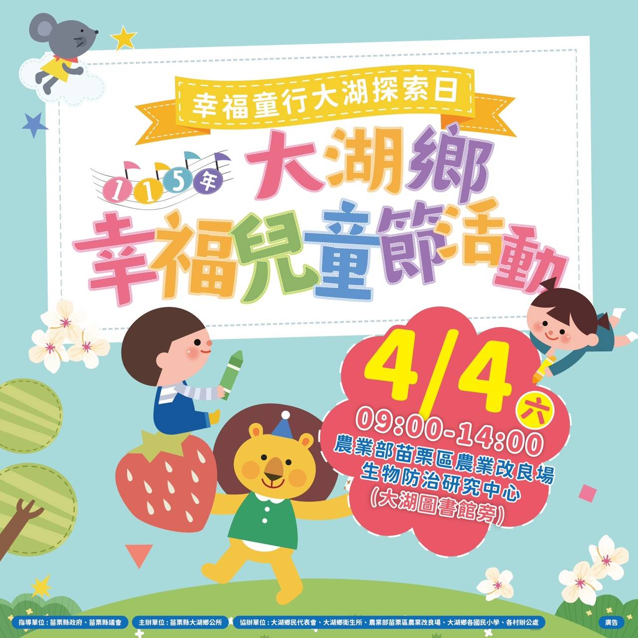 大湖鄉公所誠摯邀請鄉親攜家帶眷,一同回到大湖過兒童節,讓笑聲填滿整個節日,留下最美好的童年回憶。